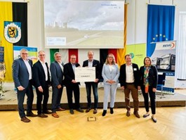 Bildunterschrift (v.l.n.r.): Jürgen Frantzen (Bürgermeister Landgemeinde Titz), Dr. Norbert Reinkober (Geschäftsführer VRS), Walter Reinarz (Geschäftsführer REVG), Oliver Krischer (Minister für Umwelt, Naturschutz und Verkehr des Landes Nordrhein-Westfalen), Volker Mießeler (Bürgermeister Kreisstadt Bergheim), Claudia Schwan-Schmitz (Technische Beigeordnete Kreisstadt Bergheim), Dr. Martin Mertens (Bürgermeister Gemeinde Rommerskirchen), Dr. Ruth Laengner (Fachbereichsleitung Strukturwandel und Nachhaltigkeit Kreisstadt Bergheim)